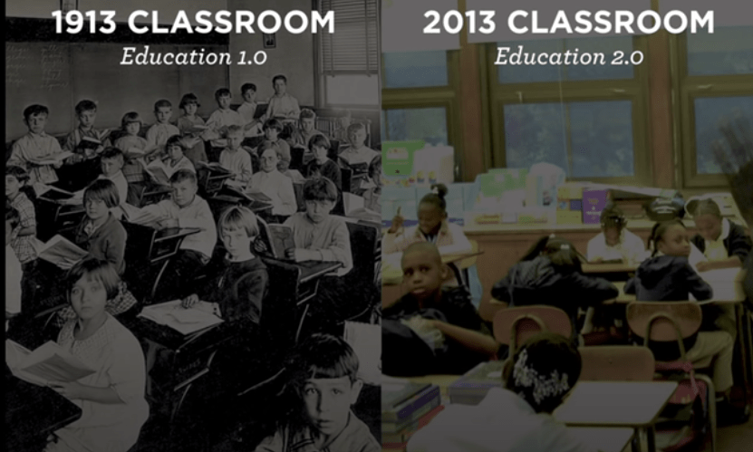 In a TEDx talk from 2013, Sajan George claimed that in 100 years, classrooms have not changed much (George, 2013). He used this picture and said that side by side, there is a 100 year difference between these two pictures. However, other than that, not much else differs (George, 2013). For example, students are still grouped by age, they sit in rows, and the teacher is seen as the “sage on the stage” so to speak. Collaborative learning continues to take a back seat in traditional classrooms, and the teacher is seen as an oracle of information. Even with all of the technological advancements we have made, we continue to use education and the current standards of today to teach students what they needed to know in the 19th and 20th century (Prensky, 2013). Prensky (2013) states that we have so many tools at our disposal, but we continually focus on the trivial uses of technology, like watching videos or projecting worksheets on a screen. We continue to do things the old way and try to also do them the new way, which is akin to keeping a horse-drawn wagon on hand in case your car breaks down. We need to start thinking about technology as extensions of human capabilities, and stop just looking at technology as the inclusion of iPads and computers.
