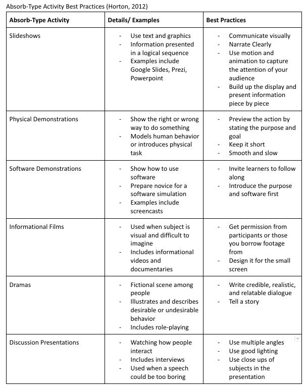 Absorb-type activities are the activities pertaining to the absorption of information, and are often intended to prepare learners for a subsequent “do” activity. Many educators and learners, myself included, think of absorb type activities as presentations, readings, or demonstrations, like slideshows, lectures, and paper documents. However, the umbrella of absorb-type activities encompass presentations, slideshows, physical demonstrations, software demonstrations, informational films, dramas, and discussion presentations (Horton, 2012).