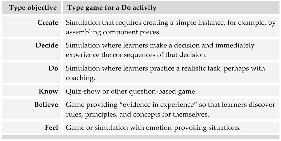 I am by no means a game designer, and nor do I expect anyone developing an e-Learning course to have those credentials either, but there are many types of game activities that can be used to accomplish different types of learning objectives. Here are some examples mentioned in E-Learning by Design (Horton, 2012).