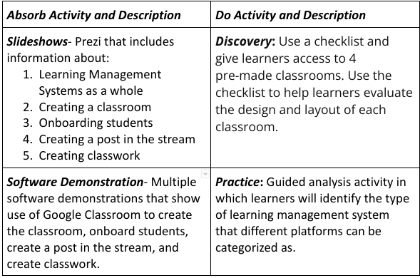 As I develop an E-Learning Course that focuses on Google Classroom, I have been able to plan, and even develop some Absorb and Do Activities for learners. Here are some of the ideas I have generated so far both after reading Horton and getting feedback from my peers.