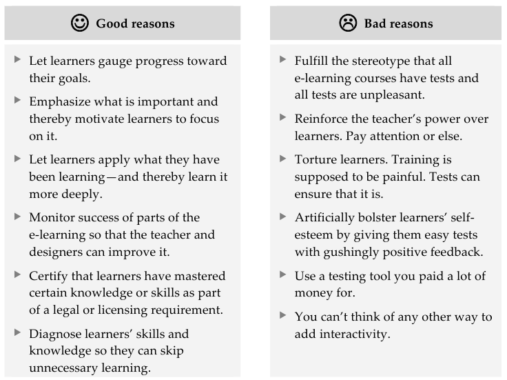 My outlook on tests has transformed quite a bit in my years as a teacher. I used to think that testing was always necessary, and tests were always high stakes affairs. However, as I have developed my e-Learning course, I have learned that tests do not always have to be like that, and in some cases, traditional tests are not necessary nor sufficient for learners to demonstrate learning. For example, would a test be the best way to measure whether or not students could create accessible classwork with multimedia on Google Classroom? I have found oftentimes that do-type activities themselves can be just as effective for the purposes of assessment. Different types of assessments can include things like open-book assessments, tests taken with partners, or learning games with puzzles. Also, when you have learners self-assess, assessment becomes a much more empowering experience.